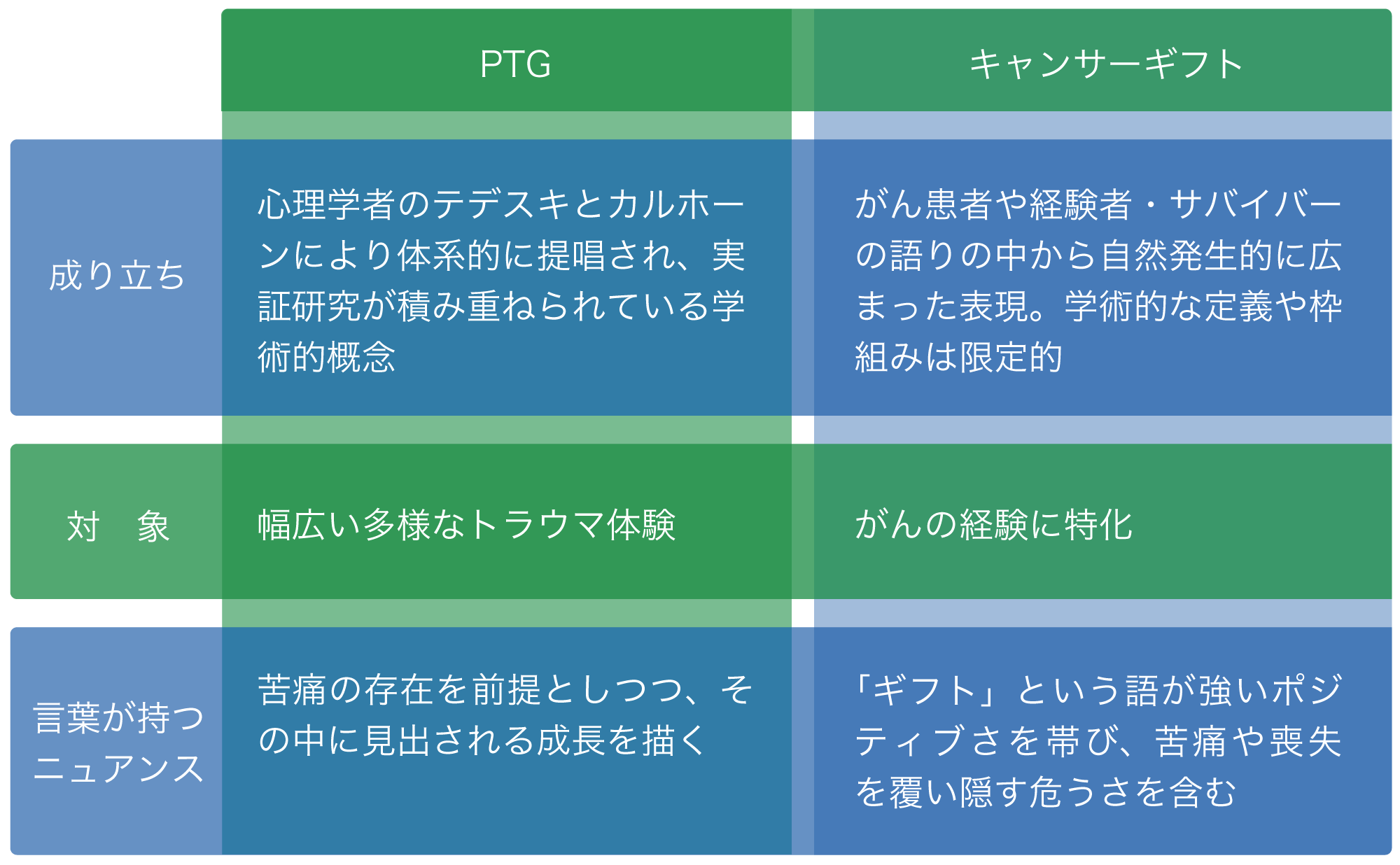 お気づきのように、PTGの5つの因子とよく重なります。そのため、キャンサーギフトは「がん」という特定のトラウマ体験を契機としたPTGの一形態、あるいはがん患者のコミュニティーで独自に表現されたPTGの姿と考えることができます。研究でも、がんを含む生命を脅かす病気や慢性疾患を持つ患者がPTGを経験することが確認されています。